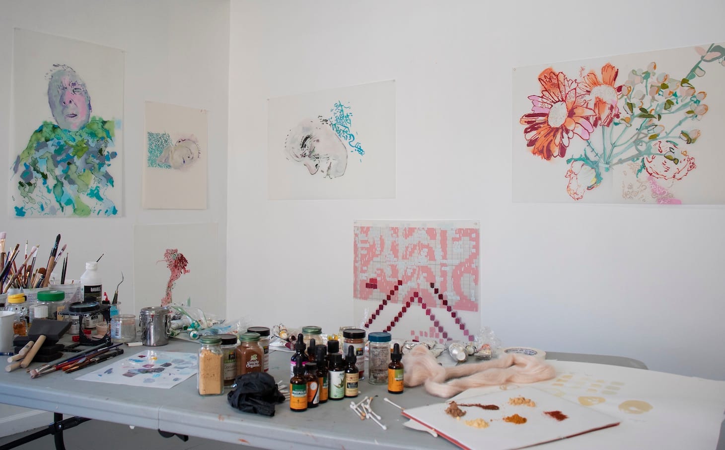 Last week, I was diagnosed with COVID-19 by my doctor. Since that time, my world has gotten very small. Although the severest symptoms seem to have passed, I still feel lethargic. Unable to travel to my studio, I begin to look around my house for supplies. First, there are all those herbs that I am taking for my immune system, then there are the spices, the teas— and suddenly my bed is my studio table. Although my geographic footprint is small, my imagination keeps expanding. I seem to have discovered my shadow side — which is not to say I feel sad or lonely. Rather, I am noticing different details in my shadow; there is a kind of intimacy with myself in the quiet.