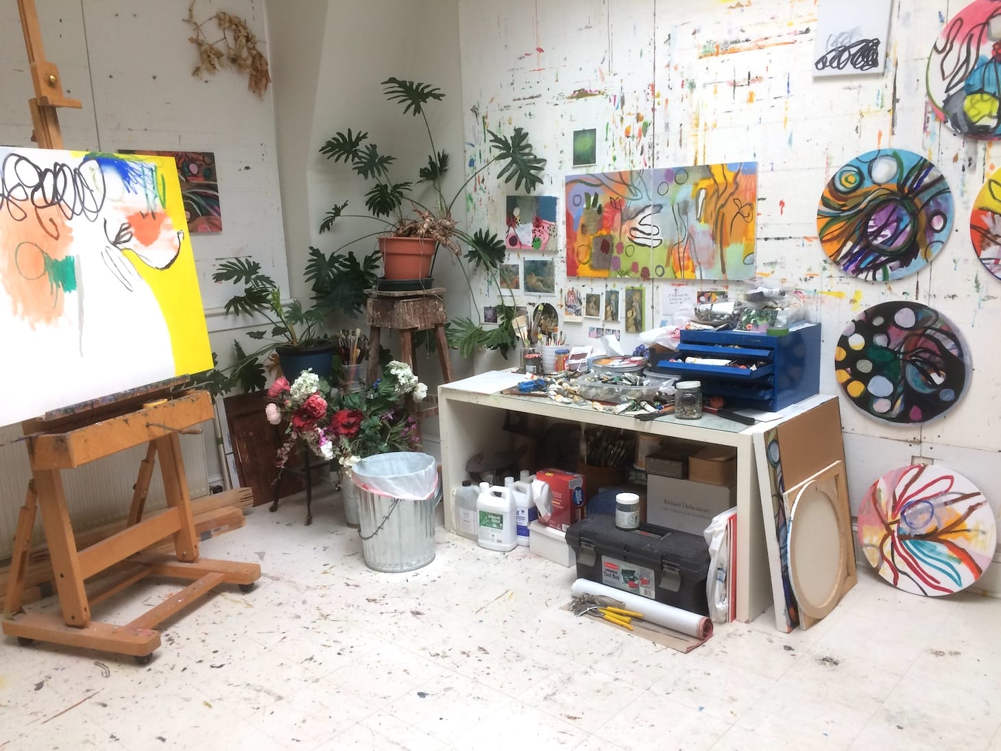 In 2001 I started painting on the top floor of my Philadelphia home. It’s not complicated. I work on one canvas at a time, yet usually have 10 to 15 paintings in varying degrees of completion. Most face the wall and I focus on the one that is on my easel. My work is abstract, but the shapes and colors of the plants, fake flowers, and view from the window, appear in my paintings. When I realized I will be inside for a long time, I rushed out and bought two gallons of turpentine and four extra tubes of paint. I now sit in the studio and just stare. To paint I need to allow myself to feel extremely vulnerable and to know that I will fail. That is how I feel, yet am unable to do much more than stare. Sixteen years ago, a painter-friend died. I admired and loved him. Just before he died, he gave me a blank canvas he had stretched and primed. He’d not yet painted on it. He said, “You paint this one,” but I couldn’t bear to touch it. This week, I realize it is time I paint on it.