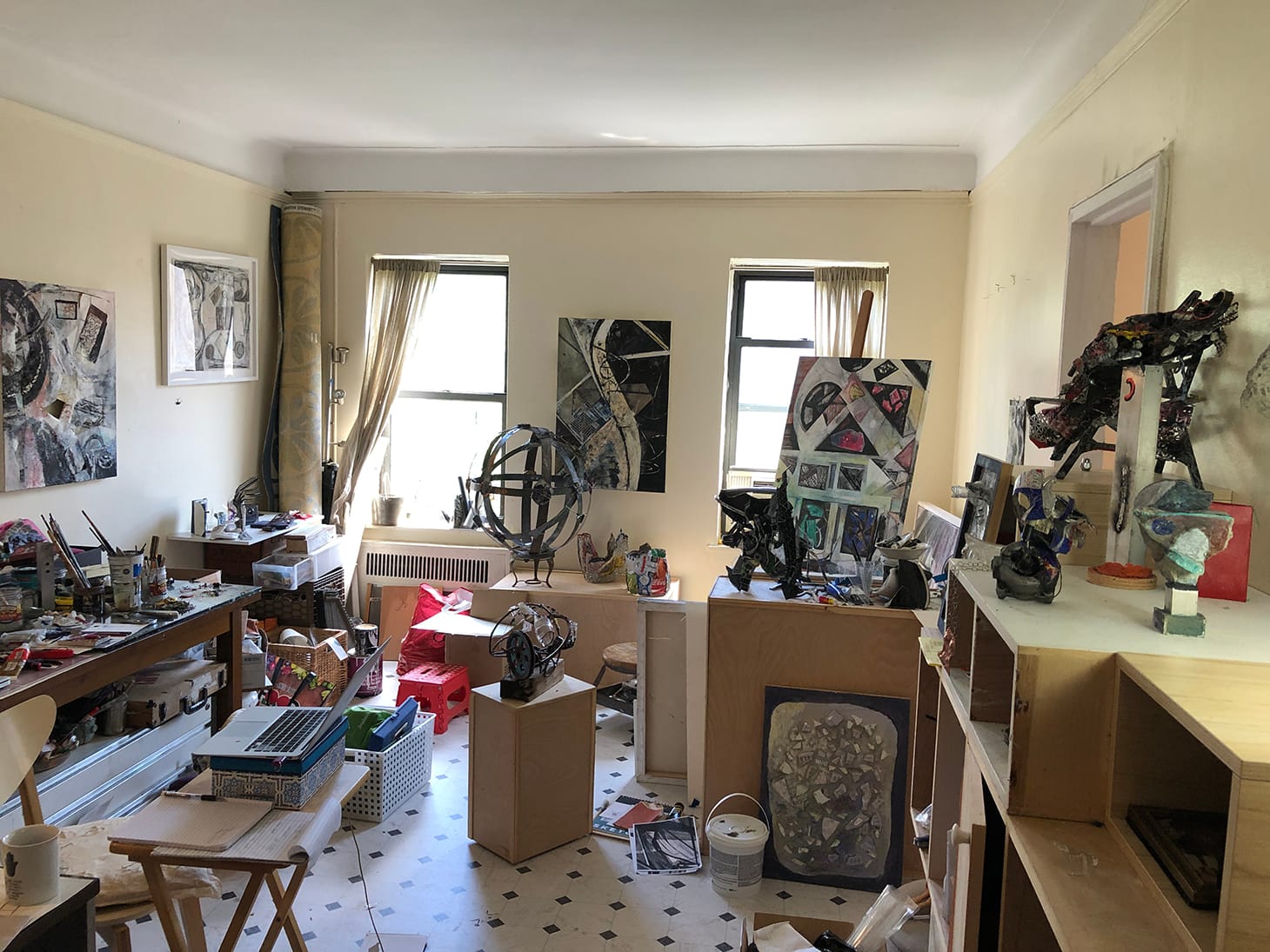 I live and work in upper Manhattan. During quarantine I made a big leap and moved my bedroom-size studio into my living room, the largest space in the apartment. With the help of my very strong 18 year old daughter, we transformed the apartment, swapped bedrooms, and are in the midst of recreating our own spaces as we desire. This photo shows my messy new studio (with fresh linoleum to protect the floors), and a variety of works in progress; wall pieces in various media, some sculptural assemblage, and lots of materials. I use cement, latex, oil paint, pastels, metal and glass, epoxies, paper.