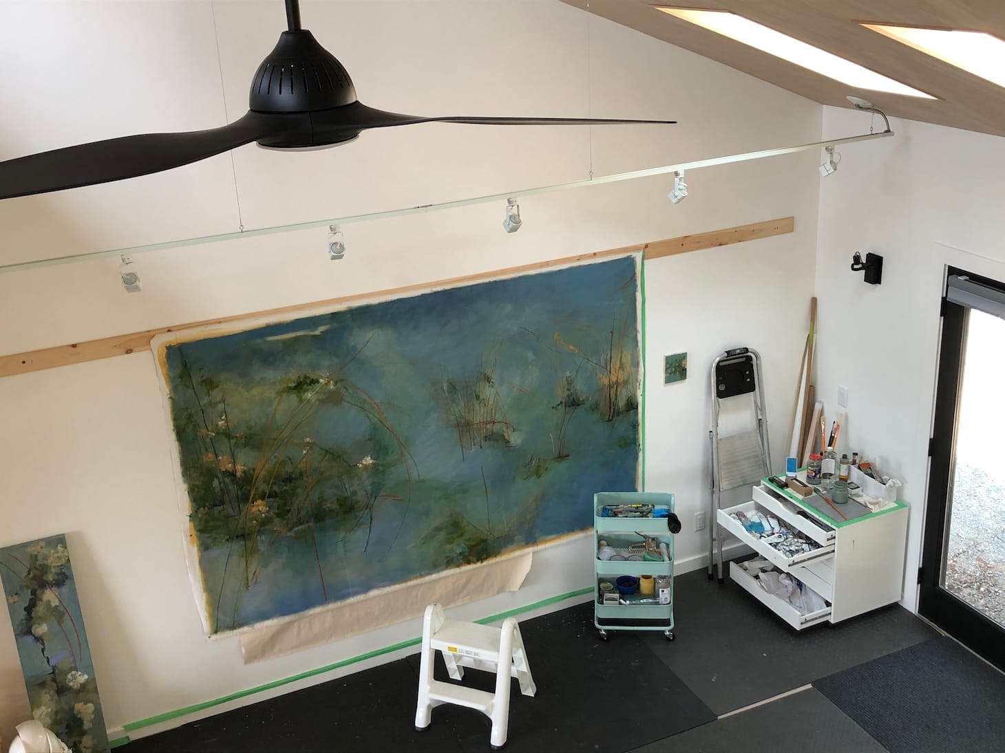 This summer I finally began work in my purpose-built studio in the Shuswap in the southern interior of British Columbia. While COVID-19 restrictions have curtailed the public part of my work with exhibitions and projects canceled or postponed, the new studio, with its big working wall, has allowed me to work on a large scale. This, in turn, has triggered a new phase in my work. These paintings are not just bigger but significantly more abstract — landscape-based rather than landscapes, in which color and light are the real subject. My heart goes out to the many artists who have suffered from financial hardship and isolation during these strange times. I have been lucky in that the isolation of my Shuswap studio has been enormously helpful in allowing me the time, space, (and shall I say nerve?) to push the self-imposed boundaries of my practice. In my old studio, large pieces had to be partly rolled while I worked on them or they had to be laid out on the floor. The main trouble with this is that you don’t really get to see the whole painting, to sit and stare, which is so often the most important thing to do. In the new space, I still feel guilty about splashing my paint on the pristine walls but I forget all about that when I’m working, and soon that problem will solve itself.