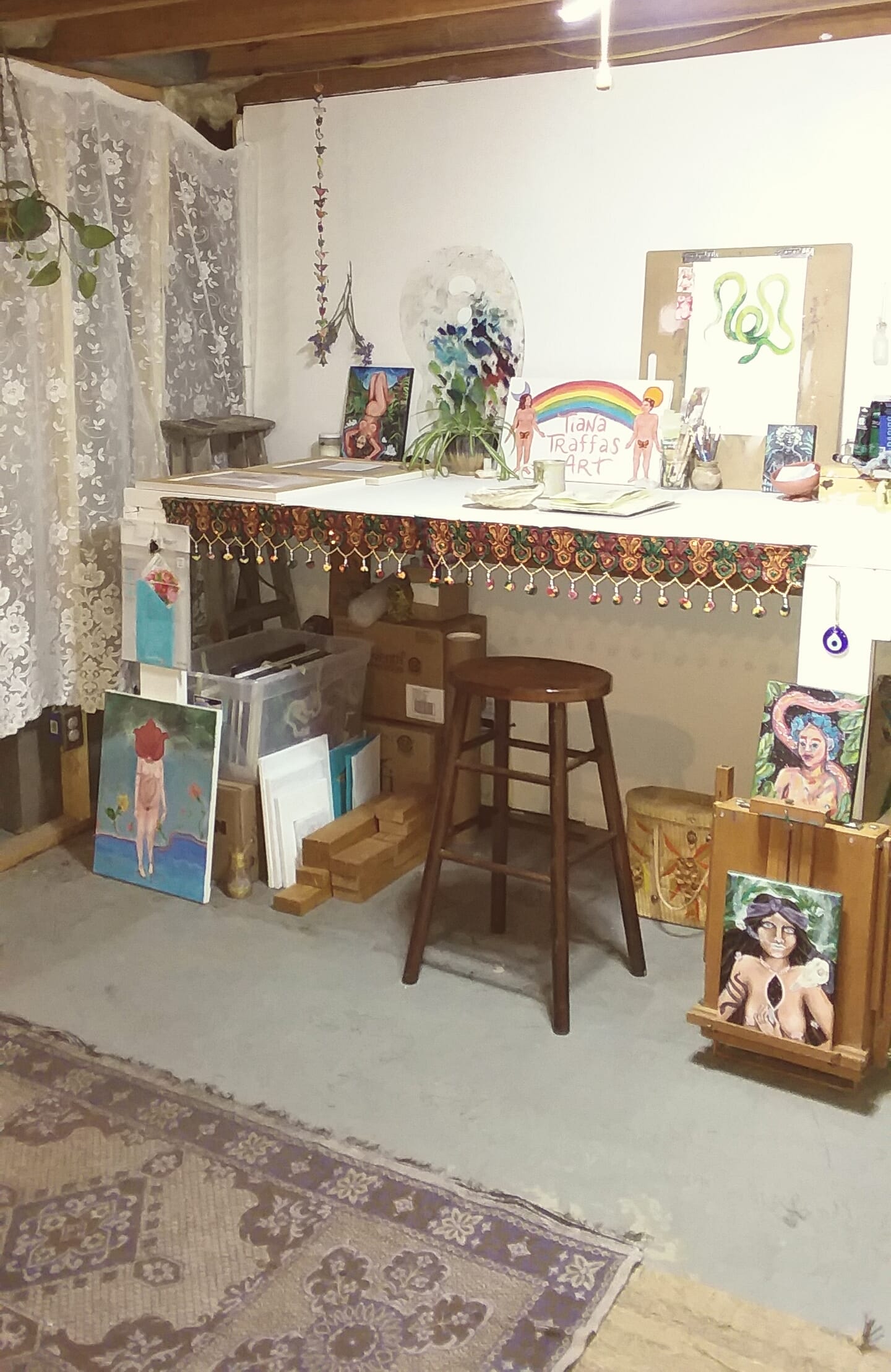 A month ago my husband suggested we rip out some old carpet and repaint our unfinished basement so we could turn it into a studio space! It has poor lighting and it's not ideal, but it's mine! I've just begun to make new work in the studio and I am loving it. I am home with my seven-year-old when I work, so she has a little corner where she can color and draw with me. I think it's important for her to see me painting and preparing for shows. I also gave her a wall to paint all by herself and she chose to make a mural of her pet fish "Bubbles." (It's awesome.) This new studio space means I have so much more space to work in. I can finally paint larger now that I'm not stuck at a small desk in the living room. At the beginning of the pandemic I felt too overwhelmed to make art. But this autumn I have had a real jolt of creative energy. I have been making a lot of new work and planning new projects!
