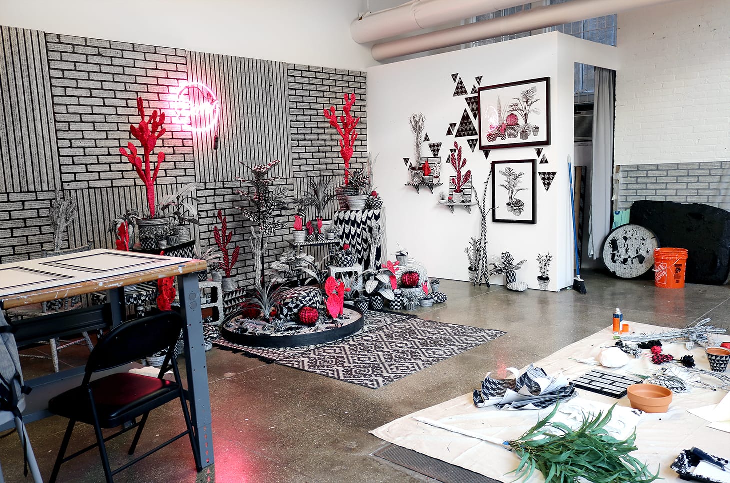 I was fortunate in that the pandemic aligned with a residency and studio space at Mana Contemporary. My work ebbs between traditional drawing, pen and ink, and immersive drawing installations — three-dimensional objects transformed into drawings. Hunkering down as we have in the city, plants felt therapeutic. It only felt natural to begin to build them up obsessively during this time so that I could begin to surround myself with the comfort of their nurturing presence.
