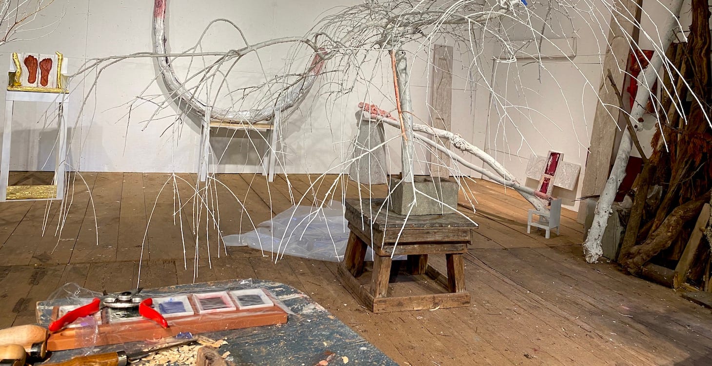 In Woodstock, living in the mountains with its trees and sky was healing. Gradually, I began to work again. The large vine pictured in the back of the photo was adjusted onto a steel base. I named it “The Cradle.” The Young Cherry tree, which died after blooming, began another life, between human and tree … and the familiar pattern which I spent my days in the studio returned. The old barn is perfect in the summer as it has no heat and is open to the elements. Its space keeps the trajectory of a tree with branches and trunks and vines in dialogue.