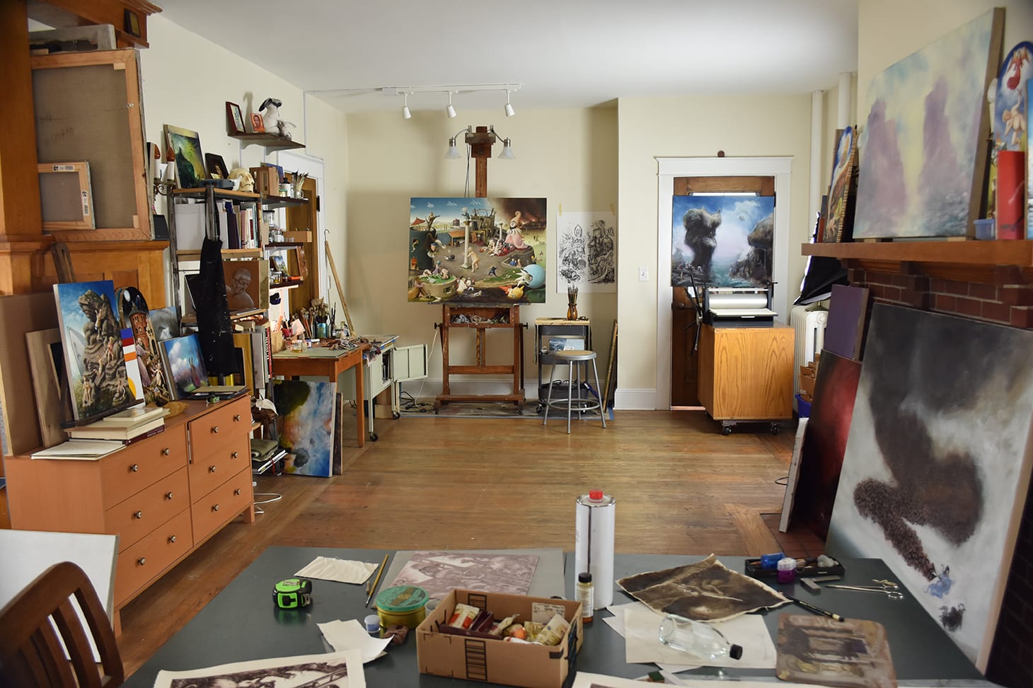 I moved my studio into this space three years ago, and for the first time since the 1990s I can step back to view my work. But my paintings have gotten smaller lately, so I end up squished into the lighted corner with a big space behind me. I've been spending more time here since everything closed last March. Somehow, there's a sense of urgency to make as much as possible during this weird time, but I'm not rushing through anything. There's a shelf of powdered pigments there and a table for making paint. I started researching old methods, layered paint, and historical materials some years ago, and it's become a regular practice to grind paint at the easel. This period feels like a right time to wade in and tie up some technical loose ends. There's a fireplace there, but as nice as the idea is, it's blocked by a stack of canvases and probably always will be.