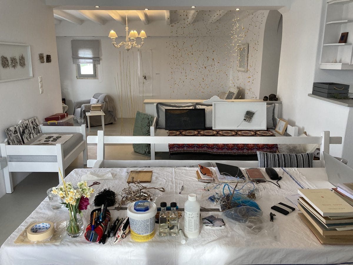 During this time, I have occupied a place that is usually rented. I can experiment with an abundance of natural materials, like branches, bamboos, flowers, seaweeds, and sea grasses; with found trash, and with materials that are only found on Paros, like the famous Parian marble. Poetry and maps are also inspiration for drawings on paper, on sea grasses, or on marble. I also crochet, embroider, and weave strands of sea grasses, using tradition in unexpected ways to talk about contemporary issues like migration, diaspora, ephemerality, interconnectedness, and to raise awareness on the ocean pollution and the fragility of nature.