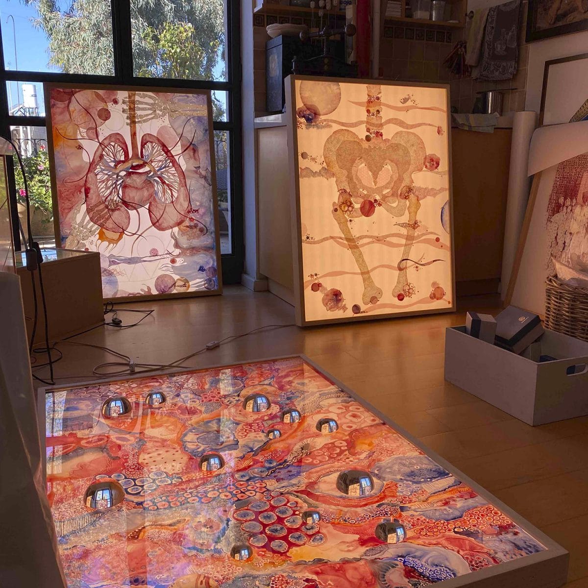 The summer before COVID-19, I started to have several friends become very ill. I began to investigate the body on the cellular level. I worked in layers on light boxes which I designed. As the virus ran rampant across the world, my work started to echo reality a little too much. I had to take a step back. It all seems very prophetic right now, but I stopped working on the body and started working on artists' books and etchings. It was just too intense. We are just coming out of our third lockdown here. My studio is still my favorite place in the house.