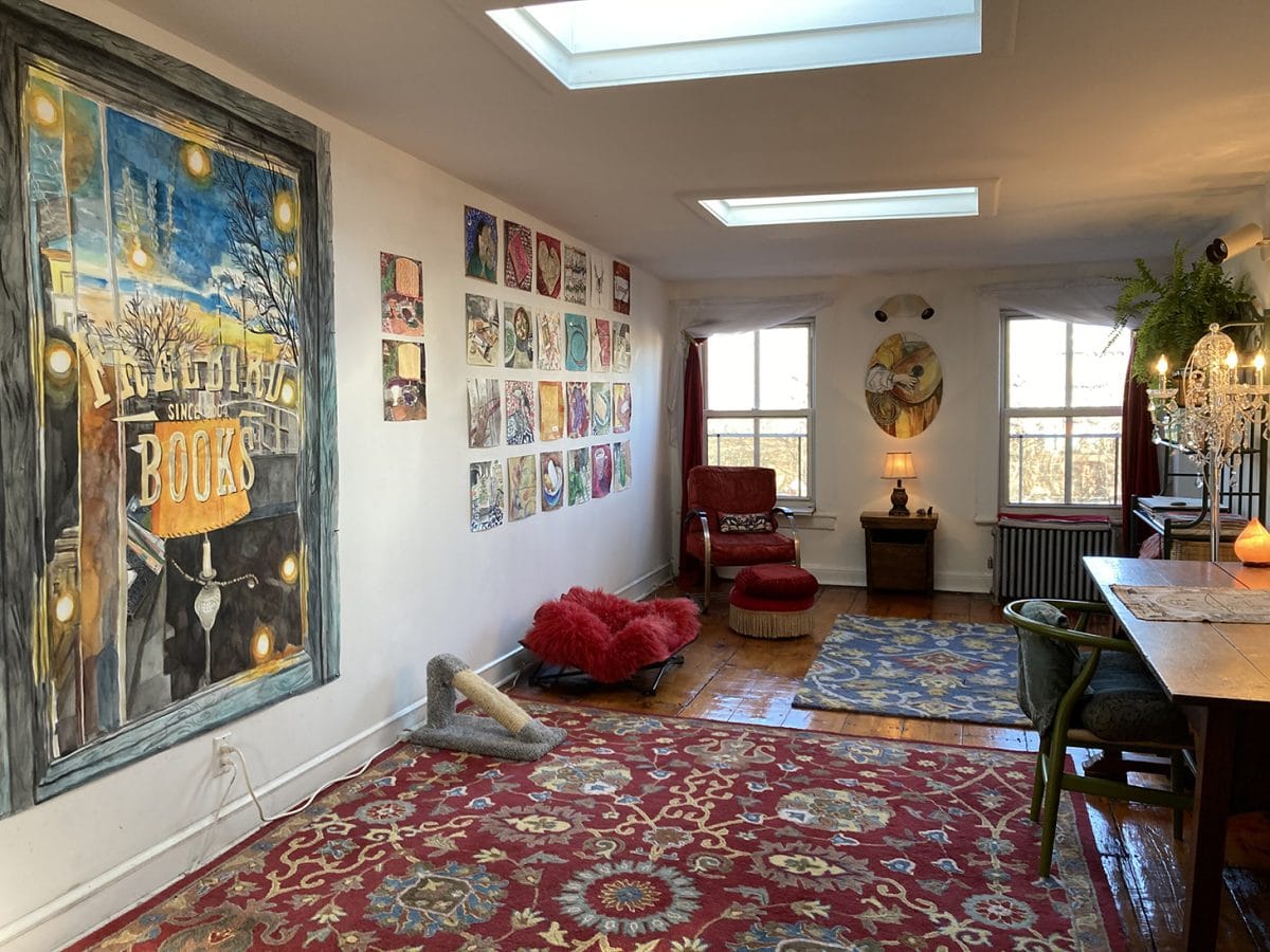 My studio is the top floor of my Brooklyn row-house. The larger red rug covers a thick stack of large paintings and drawings on paper. It makes for a strangely buoyant surface to walk on! There is shelving on the back right, and a desk where I work on smaller pieces. I pin paper to the wall and work standing in the area just before the large painting on the left. I share my studio with my cats Rik and Lola. You can see their luxurious bed and scratching post in the photo.