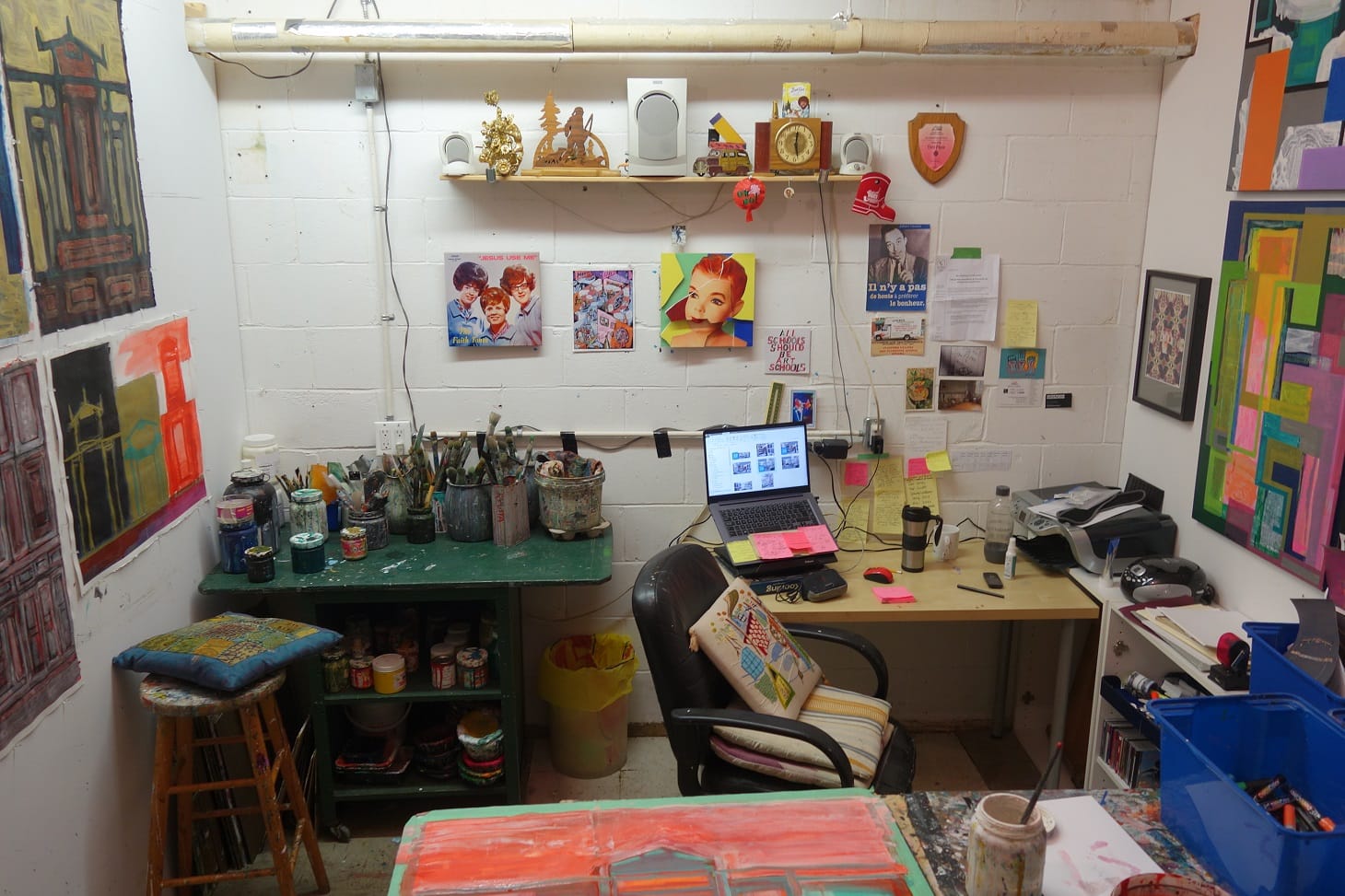 I am one of eight artists who have studios spaces at Platform Gallery and Studios, in Ottawa, Ontario, Canada. The studios surround a gallery space for both group and individual shows. My 155-square-foot space is windowless but has high ceilings that accommodate tall, deep shelves and wall space. Because of COVID-19 we have a studio schedule that allows each artist a four-hour time slot, day or night, several times a week, one artist at a time. Since I’m the studio manager I get a little extra time for disinfecting the shared washroom, wash-up sink area etc. Everything seems to be working OK but we miss the face-to-face contact with fellow artists.