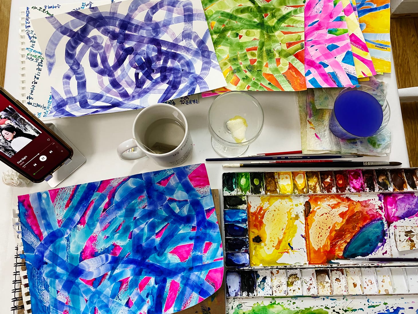 This is a photograph of my current work station, where I am painting in watercolor. For the past three weeks of quarantine, I have been unable to access my studio. My small dinning enclave has been converted into a temporary studio for my watercolor series. While oil is my primary medium, I occasionally engage other forms — and this time of hardship gave me an opportunity to return to watercolor. I am excited about sharing this chapter of my artistic practice with viewers.