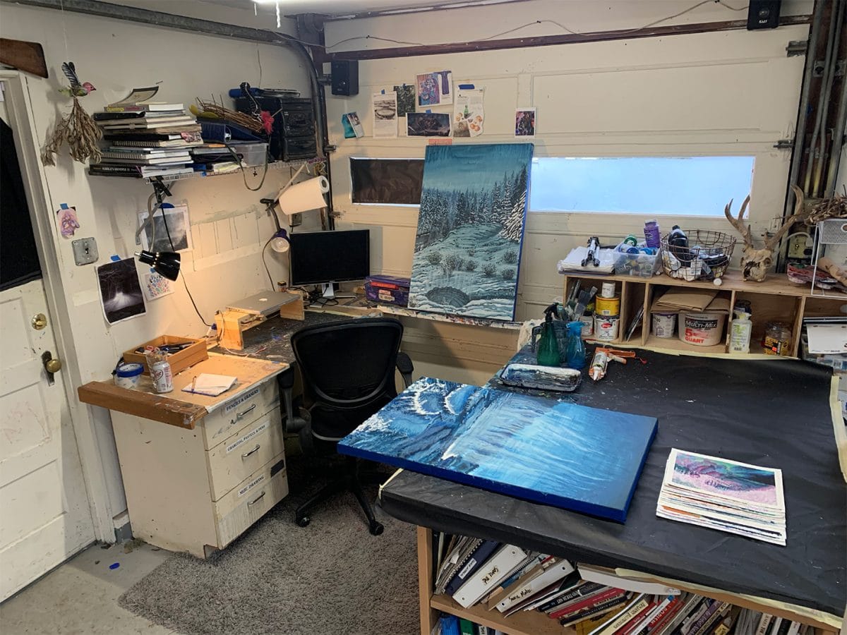 My studio space means the world to me. It is where I paint mysterious lands seeped in magic, wonder, and fear. Since the pandemic started, my studio has become my social world and virtual classroom where I teach college students to draw while my five-year-old son plays nearby. Approximately 15 feet from the back door of my house in Portland Oregon, this oasis of art, work, and family lies.