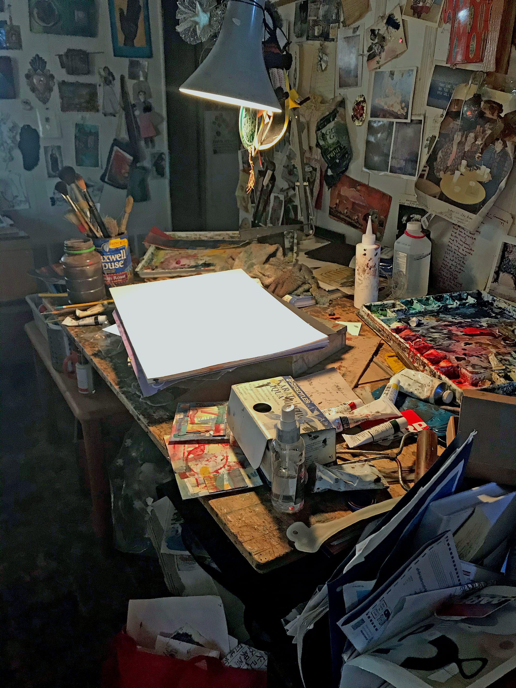 I have always been a more serious artist than my studio space would imply. I carry out my practice on my kitchen table, the floor between bedroom and bathroom, and on a drawing table in the living room. The pandemic cut down even on that small space because cooking has become almost as important as art making these days. For that reason the kitchen table is off limits.