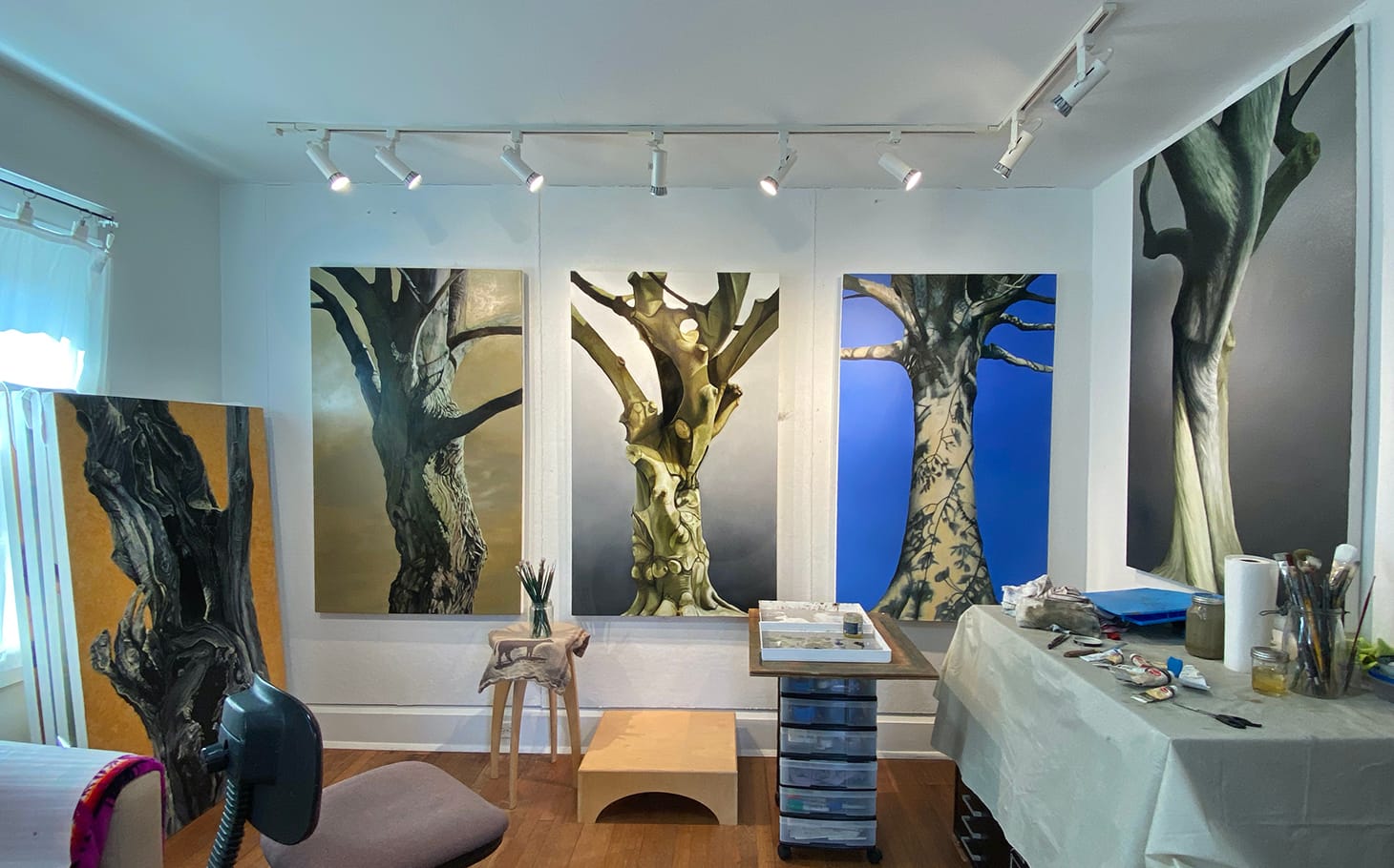 The quarantine has helped me to become an artist, once again. Before teaching art for 30 years and before having children, I thought of myself as an artist. Later I became more of an artist-in-waiting. The beginning of the pandemic found me in a web of obligations which the quarantine released me from. What remained was so simple; daily walks in the woods and painting. I took pictures of trees on almost every walk and now feel that I have a lifetime of visual inspiration and a deeper connection to nature. I have quieted down and am able to hear myself better and understand more of where my artistic ideas come from. My studio has become the focus of my days and my life.