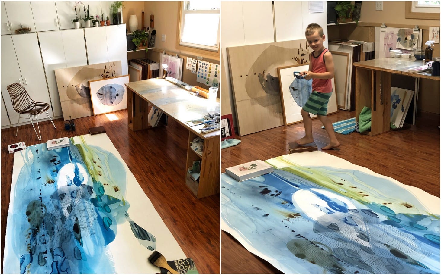 Slowly I found fulfillment in the small marks I added to my sketchbooks. Sometimes the opportunity would come while my kids were playing in the yard, sometimes while sitting by my kindergartner during his online school meetings. The daily routines became more fluid. There was more time, and yet less rest for the mind. I started getting up at 5am to make up for the lost studio time. I became more prolific. Small sketches turned into large paintings. Lately, I often wonder if I will remember this period of togetherness and reflect on it even with a sense of nostalgia, once my studio resumes being again just that — a studio. No longer a makeshift classroom for my five-year-old brother-in-arms.