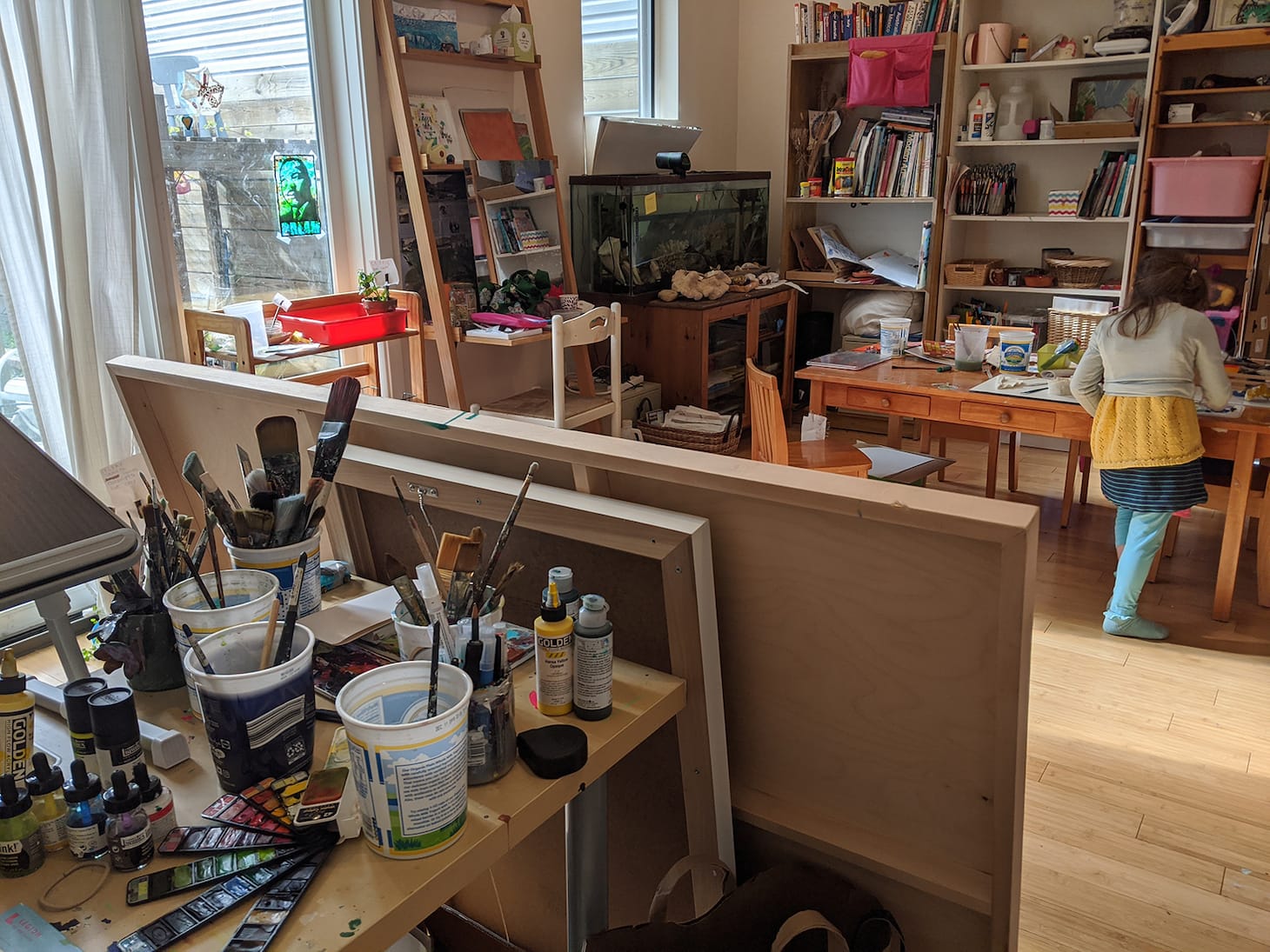 In addition to being a working artist, I am a long-time homeschooling mother of three. My husband and I built our home directly across the street from our long-time studios. Before the lockdown, my studio time occurred when my children were occupied for long stretches — at day programs or with a babysitter. I was making very large paintings with Flashe and acrylic spray paint, and developing walkable Virtual Reality paintings. Now, without childcare help, I have brought most of my supplies home. I now work during Minecraft time, at night, weekends, and when my youngest wants to paint alongside me. During our first days at home, I rearranged our craft room to become a joint studio for me and workspace for all of my kids. When the weather is nice, I take everything outside onto our patio and work out there. We set up the VR equipment in our bedroom. Prior to the pandemic, my process relied upon travel for much of my source material. Now, I am clicking along Google maps street views (from our cancelled trips) and painting from my many snapshots taken during our very brief, socially distant outings into bits of urban nature.