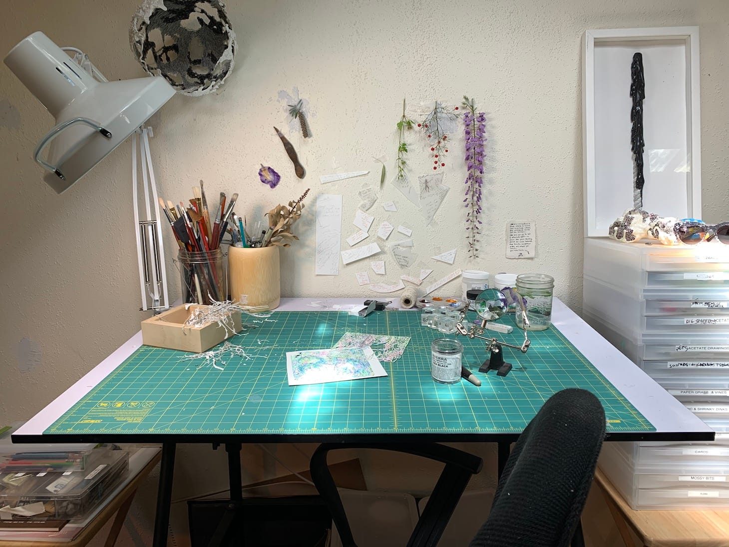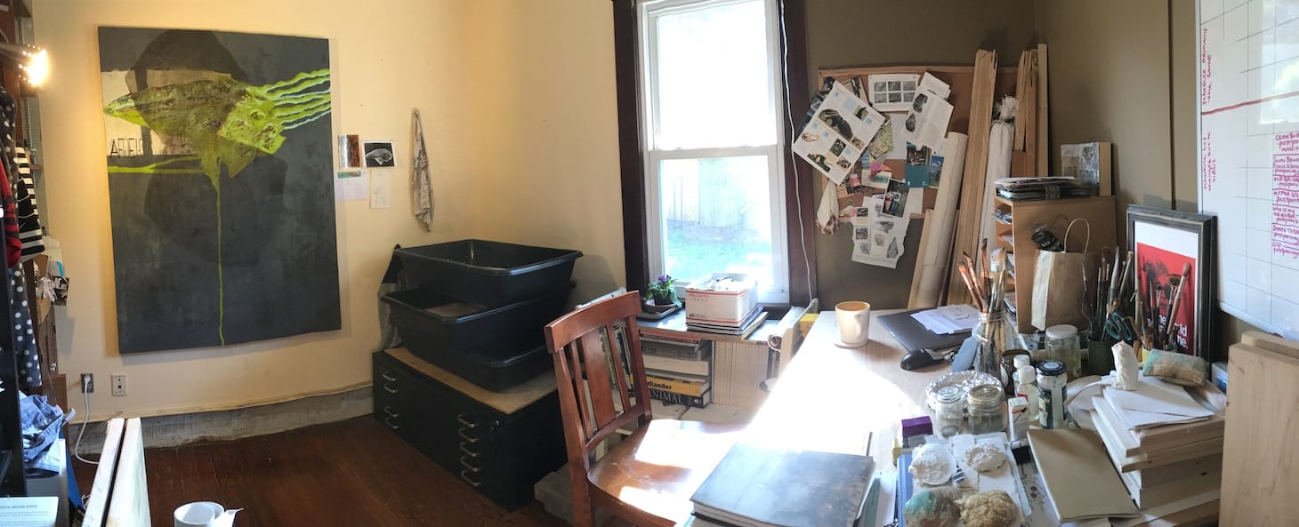 This the 158th installment of a series in which artists send in a photo and a description of their workspace. In light of COVID-19, we’ve asked participants to reflect on how the pandemic has changed their studio space and/or if they are focusing on particular projects while quarantining. Want to take part? Submit your studio — just check out the submission guidelines.