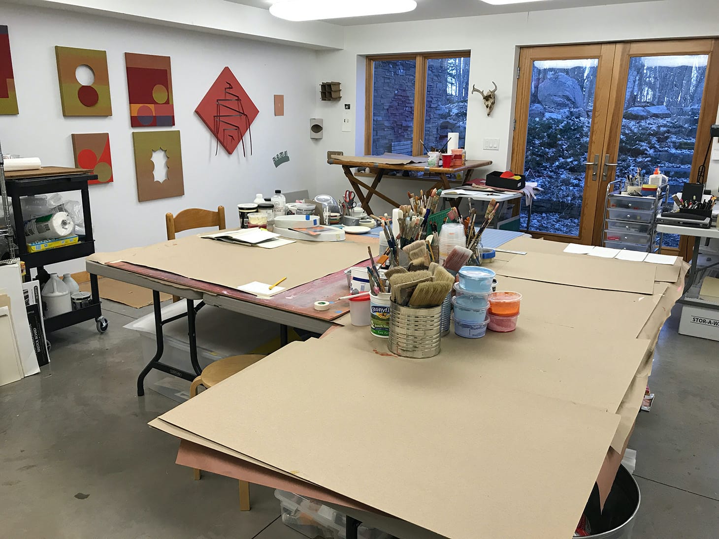 Being a basement room, the ceiling in my studio is low, but I have enough room for a number of tables. The table surfaces are where I sketch, design, and paint. During this time I’m creating a family of works to keep me company, I think of my abstractions as social bodies.