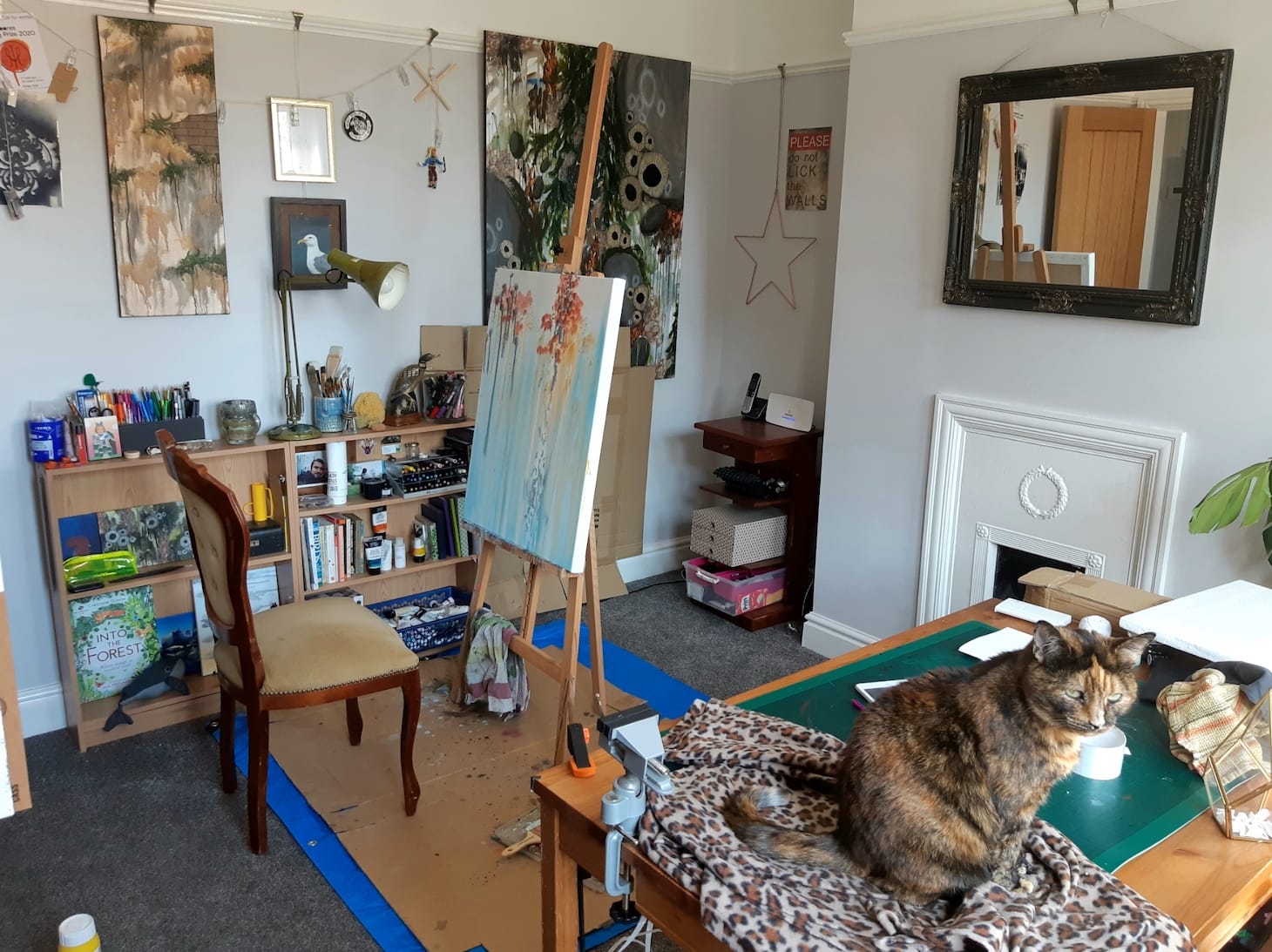 We moved in last October and the carpet’s new, so I put a tarpaulin and some cardboard down because I’m a very messy painter. We had some spare cabinets so they’re full of canvases, spray paint, and hoarded bubble wrap. I found the fancy chair in a skip. The table was our dining room table, but we never used it so I stuck a vice and a cutting mat on it. It’s the cat’s favorite place to sleep. I work full-time in an art shop so I kind of collect art supplies and like to have them displayed, but then the acrylics I use all the time are just in a big jumble in a basket by the easel. There’s a picture rail so I can change what’s hanging, and I keep lots of mementos and plants in here too. Since being furloughed six weeks ago, I bring in my coffee on a morning and put on music and paint a canvas, or plan some other project, and it gives me a purpose for the day. It felt self-indulgent to have a studio when we moved in, but it’s the thing keeping me sane now.