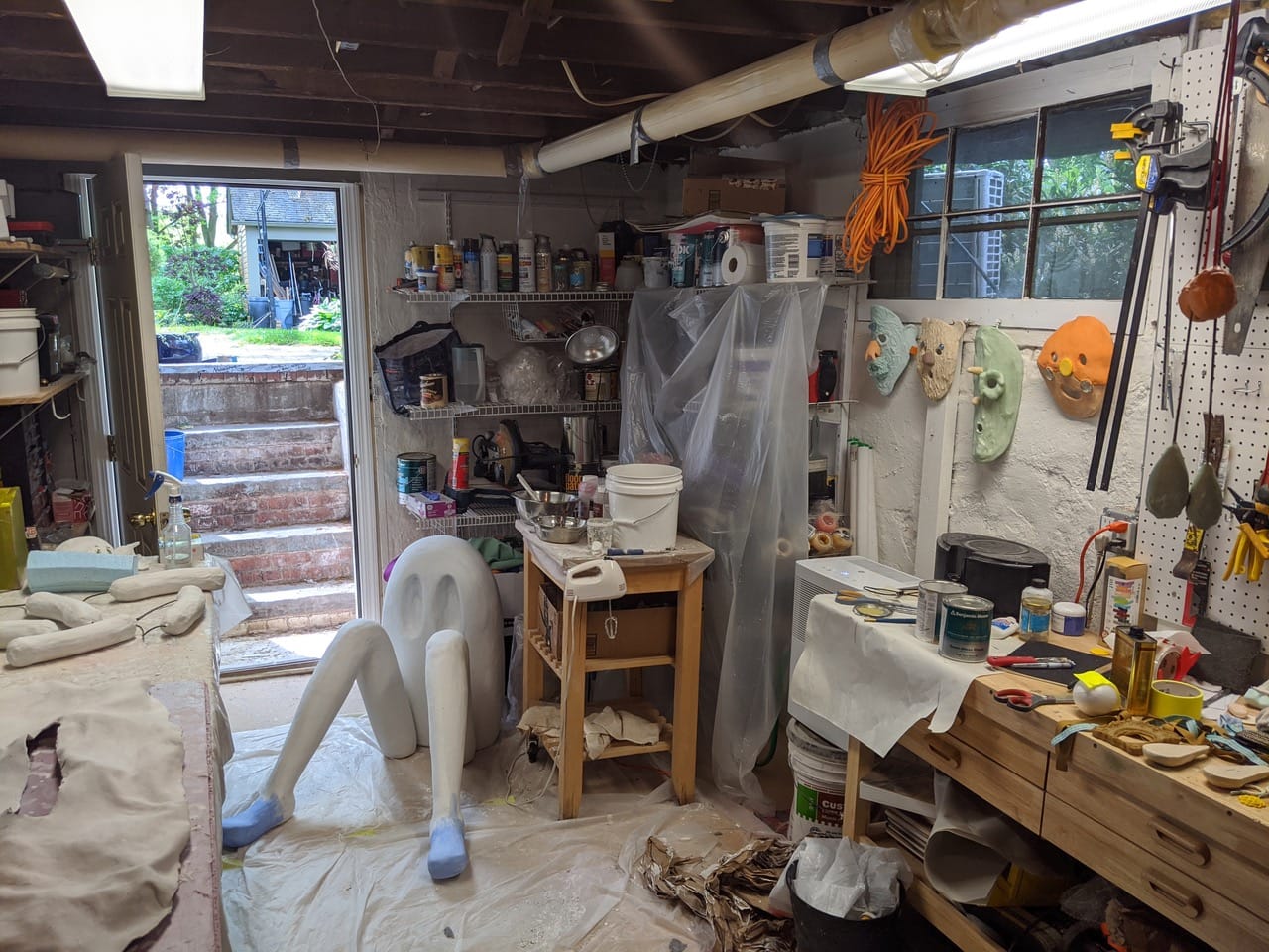 I was planning to sit out the lockdown in Manhattan because I could walk to my studio and there was plenty there to keep me busy. But when my boyfriend said he was going back to his home in New Jersey, I agreed to join him. I set up a makeshift studio in the basement where I work between bouts of remote work, cooking, and exercise. It is hard to focus and get a full day in the studio with all the distractions and swirling anxiety. I brought the basic tool kit that I might bring to a residency and picked up some materials at a local hardware store. I found a wooden kitchen cart on the street and a folding table in the garage to work on. I mix my plaster and pigments on the cart with a hand blender. Often I hang pieces from hooks on the ceiling so I can work on all sides of the object. I feel lucky to be here and have a space to work on my art.