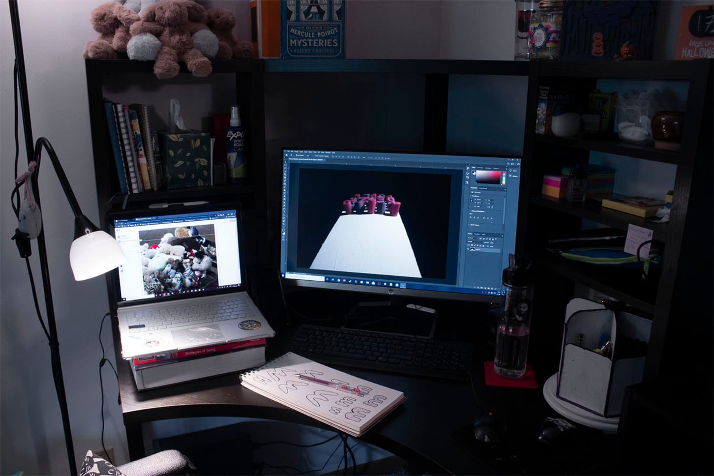 In the photograph sits my desk — an organized clutter of my daily items. Typically, I’m a metal audio sculpture artist, though in the current times I find it difficult to work in the medium I love. The desktop has a photo from a series I am currently editing, to add to my website in the future, and the laptop screen displays the homepage of my website which I have been updating a lot lately. Next to the keyboard lies a sketchbook with the letter “M” written many times on the page, some of the letters are filled in with small circles. This is so I can occasionally focus on something that requires my hands and isn’t on screen.