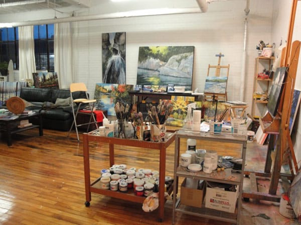 This is the most luxurious, glorious space I have ever had to work in. It is a 1,000 sq ft studio in a converted mattress factory. I share the studio with another painter, Walt Pascoe. I am usually working on several pieces at a time so I have a few easels and a huge wall to work on. I love that I have enough space to work on four or five canvases at the same time. Working in this manner allows the paintings to inform each other.