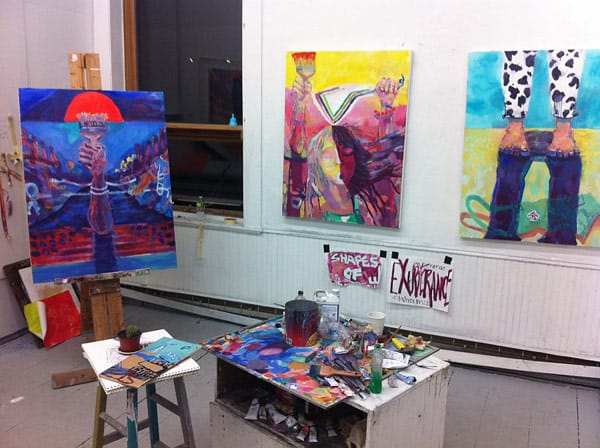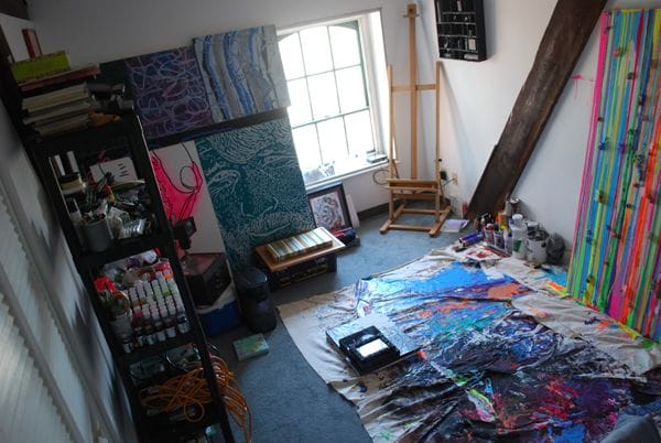 Generally there is music flowing throughout the space which helps me to let go of my chattering brain and enter into a more intuitive state as I approach the paints. There is a great couch for napping, reading and daydreaming. There is a small kitchen for food and coffee breaks and lots of other artists in the building for feedback and stimulation, although most of the time I prefer to work in solitude and let the paintings guide and instruct me.