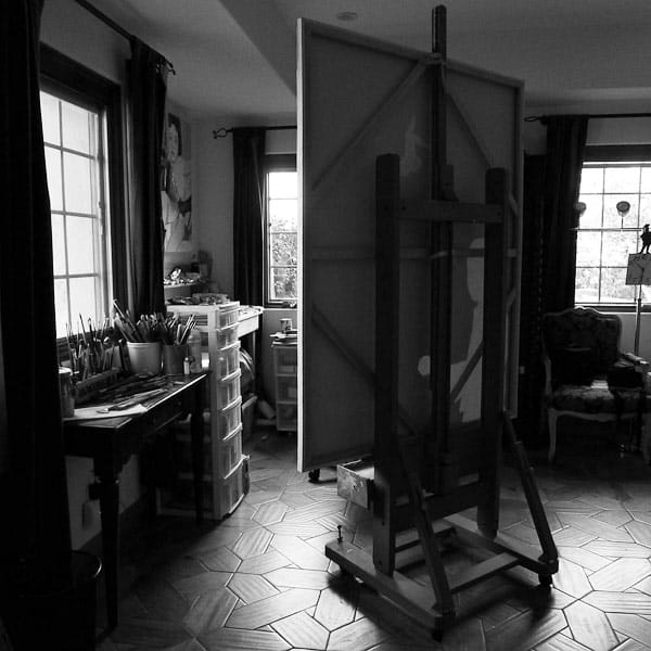 I love the light in my studio, and painting there with my iPod dock blasting is as close to nirvana as anything can be. I spend every day there and sometimes if I have a deadline for a show or commission, I’m there at night too. I have powerful daylight bulb lamps that do the job quite nicely at night.