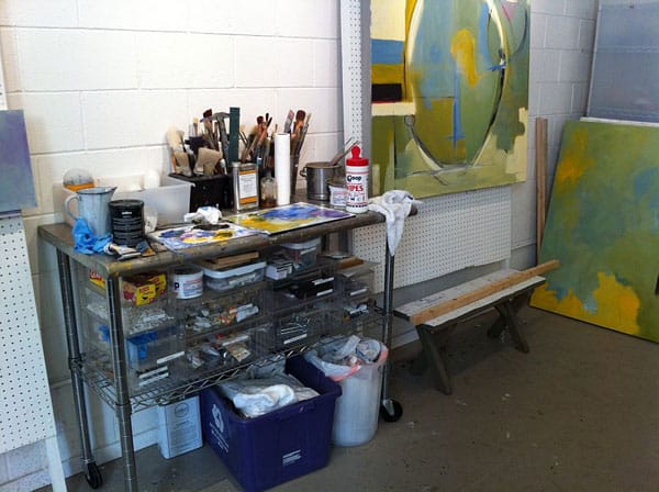 Seen here is the storage bank of 30 or more oil paintings, gicleés and prints. Easel, wood panel studies, acrylics, boxes and bins of overflowing semi-organized paints, mediums and brushes. Because of intermittent working hours, I enclose my oils in a covered palette box so they are available at a moment’s notice.