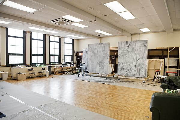 I had to build the two large 8-ft high rolling easels due to the fact that the landlord did not want anything to be affixed to the walls, which ended up making the space much more versatile. The 12 ft ceilings and plenty of light, both day and night, allow for great working conditions.