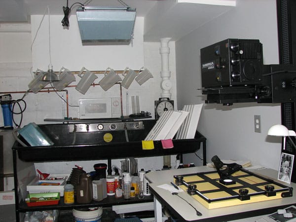 In the darkroom, I do wet chemical processing of medium-format film and gelatin silver prints up to 16’x20’. Film is developed in cylindrical tanks, and prints are made in a series of chemical bath trays. Sometimes I will later collage other papers, or 3-D objects, onto the faces of the prints. Other times I will make many copies of the same print, cut them up and then collage them into kaleidoscopic abstract patterns.