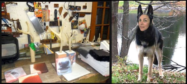 I’ve been doing art since an early age and this is the first time that I have a big, real studio — a space where I can leave things out to dry without having to clean up. The left-hand side of the photo is a close-up of my working bench, with a few pieces that will be on show soon. The right-hand photo uses a landscape view from outside my studio. The studio is located at Casa del Arte in the Hudson Valley. It’s a unique building, reminiscent of a round-arched Mediterranean castle. It’s an amazing environment, and an ideal space for creating.