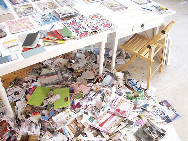 I find a lot of visual stimulation in contemporary periodicals, looking for patterns, colors and objects and interiors which act as shard-like visual aids, spring-boarding a work or nestling into an existing one.
