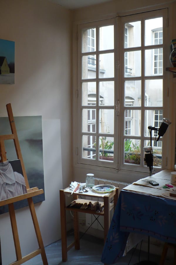My studio is in a 17th century building. There is not much space in it and all the floors are covered with plastic sheets to protect the original wooden floors. Most of the time I work on smaller scale paintings so I do not mind the size of the space. When you look down through my studio’s window you can see an interior court flanked by walls on four sides. The building is in the center of town and once you enter and stand in the middle of the court, all sounds of the city are shut off.