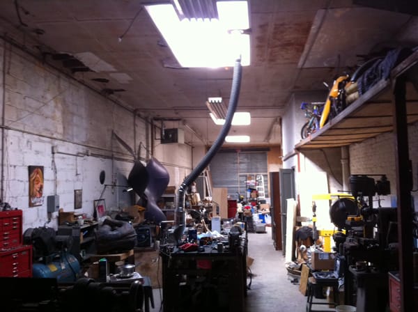 Below, the large circular thing is the flywheel for a punch/press, and then a drill press next to it, then a milling machine and pinkish table/cabinet. In the center is a work table with stuff on it. The hose from out of the movie Brazil is for ventilation from welding and patina fumes.