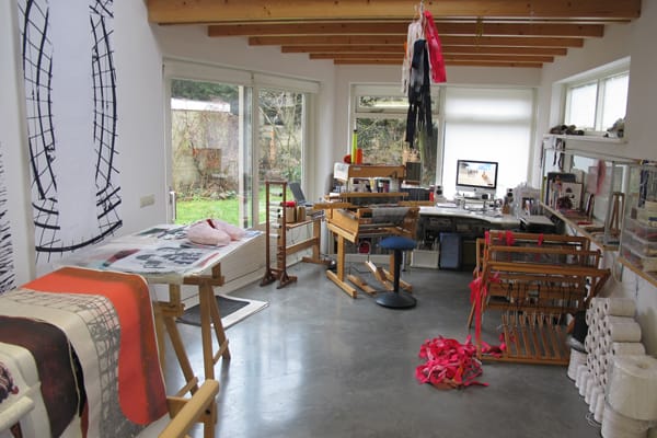 No music most of the times. A lot of dictionaries and books for my work as editor and freelance writer. The picture shows three looms: the computerized one from Switzerland, a sturdy Dutch loom and a foldable American darling. Maybe this is a metaphor.