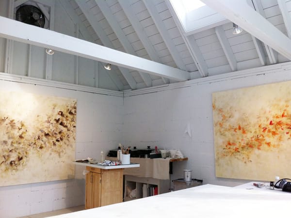 This is my winter studio in Georgia. Skylights and french doors let in an abundance of natural light. I paint large scaled, nature-based abstractions in wax, with a blow torch.