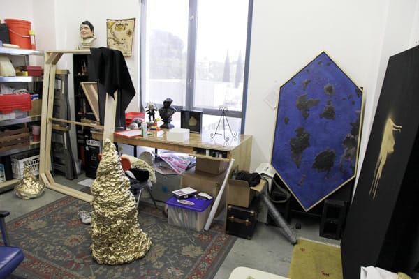 I always collect rugs for the studio. When I am exhausted and not ready for my hour and half commute back to LA, I lay on one of them and listen to one of the five Edith Piaf CDs my wife downloaded on the laptop. Most days you will find me buried in the middle of all my pieces, looking halfway between a crazed archaeologist at a swap meet and a guy that paints your car, hopefully with my respirator on, with gold fingertips, plaster-splattered jeans, ramen or hot-sauce splattered shirt and desert boots, trying to practice my own little humble form of alchemy.