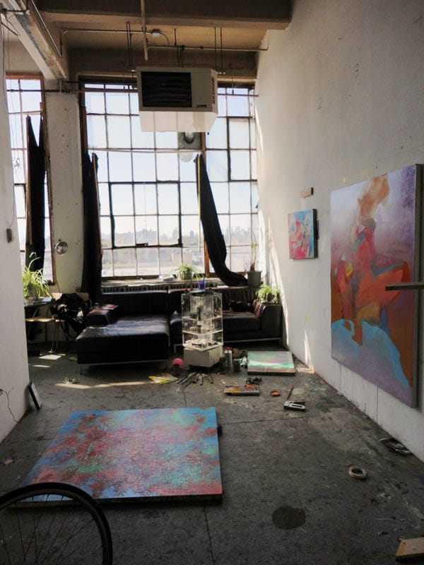 Part of my process involves dripping medium on top of my paintings in order to work wet on wet. I often rotate my canvas multiple times and work both on the floor and along the wall. This constant repositioning allows for the floor to take the place of a tabletop. The clear Plexiglas display case was salvaged from an art store and is used to store and organize my tubes of paint. My favorite aspect about working in this environment is the exposure to the sunset’s vibrant hues that have found their way into my palette.