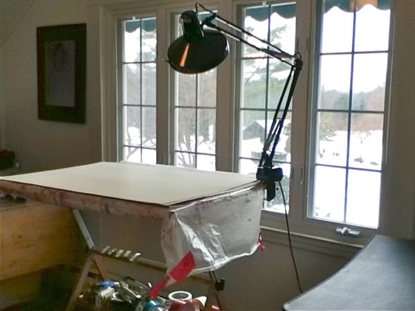 My studio is an apartment of two smallish rooms over a garage, with terrific north and west views of a New Hampshire landscape. I ride my road bike up here on a trainer during the winter, with boom box blaring. My collaged paintings and wall sculptures begin on the floor — where they serve as a drop-cloth for one another — and eventually end up on the table or wall.