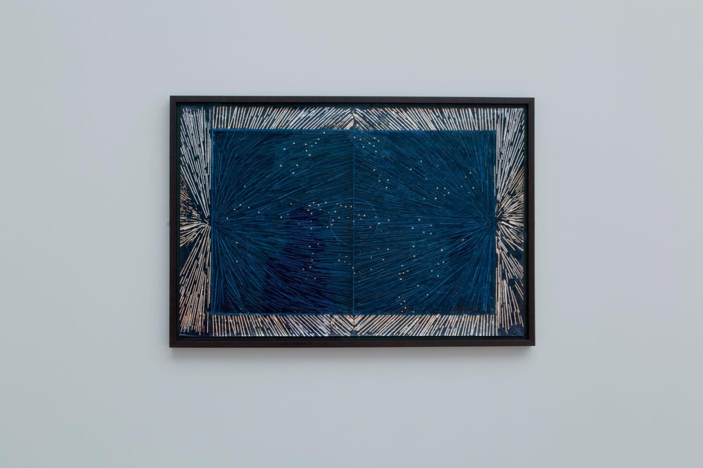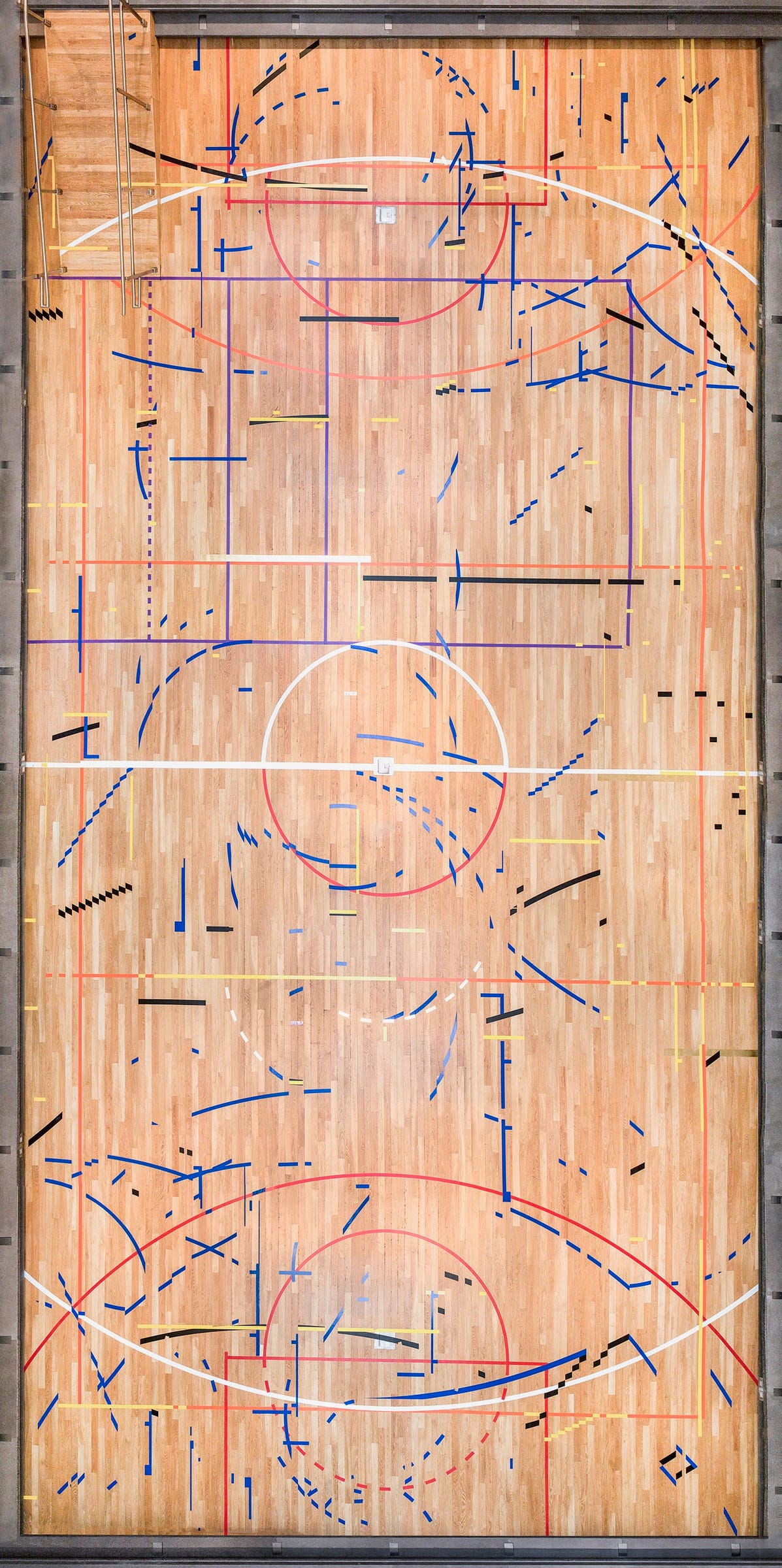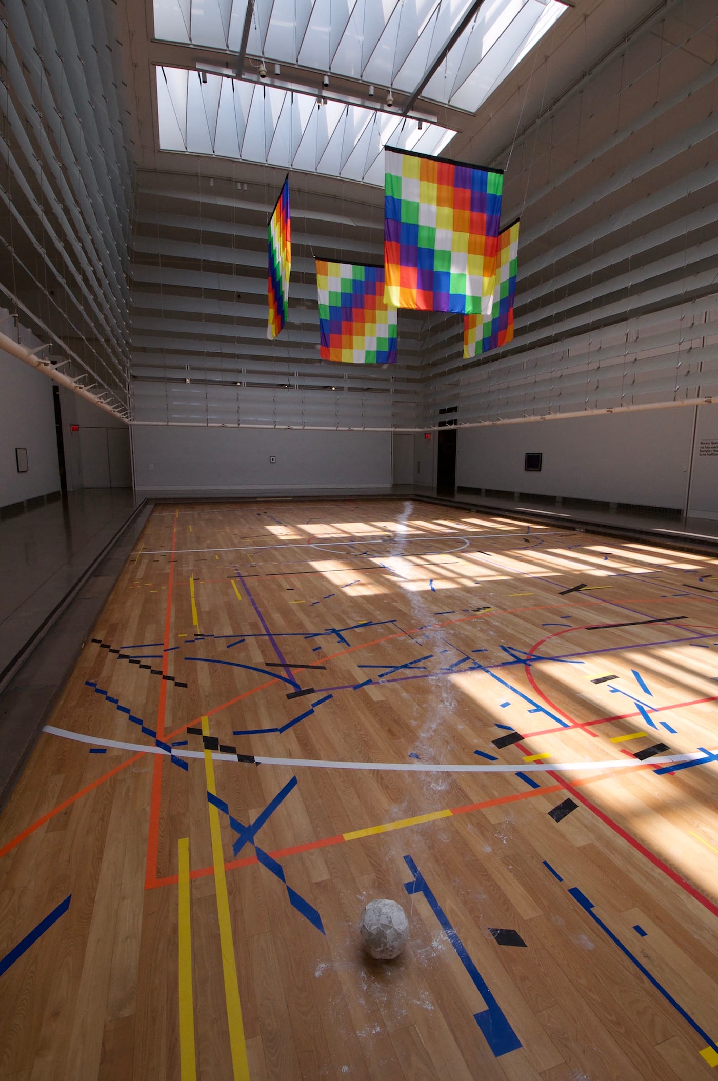 Ronny Quevedo’s no hay medio tiempo / there is no halftime exhibition at the Queens Museum revolves around a polychromatic line drawing, rendered in vinyl tape, on the polished wood floor of the museum’s atrium. Many smaller works, including digital prints, embossed paper pieces, and custom-printed nylon works, hang on the periphery and deserve their own discussion, but I want to focus on the floor drawing. It depicts the markings one would typically find on a field or court, configured for playing an organized game. Quevedo references basketball, soccer, volleyball, and handball courts, but the indicia are fragmented, lain one on top of the other, which Quevedo tells me is about breaking down barriers and seeing these spaces as negotiable.