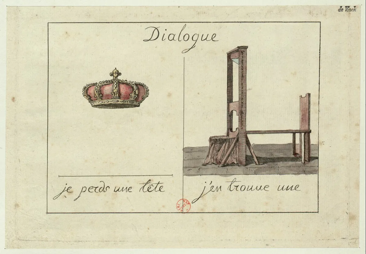 Artist Johannes Adam Simon Oertel, in a painting composed in 1853 now exhibited by the New York Historical, depicts an anarchic crowd assembled around the statue atop its pedestal; torch-bearing colonials have strapped ropes to the side of the piece and begun to topple it. Contrary to bad-faith bloviating from chuffed right-wingers about the removal of Confederate statues a couple years ago, Oertel’s painting reminds us that many Americans have always known what commemorations of tyrants deserve. The French, true to their sardonic reputation, marked the execution of Louis XVI with a representative cartoon showing a crown and a guillotine side-by-side, the former captioned “I am losing a head” and the later with “I am getting one.”
