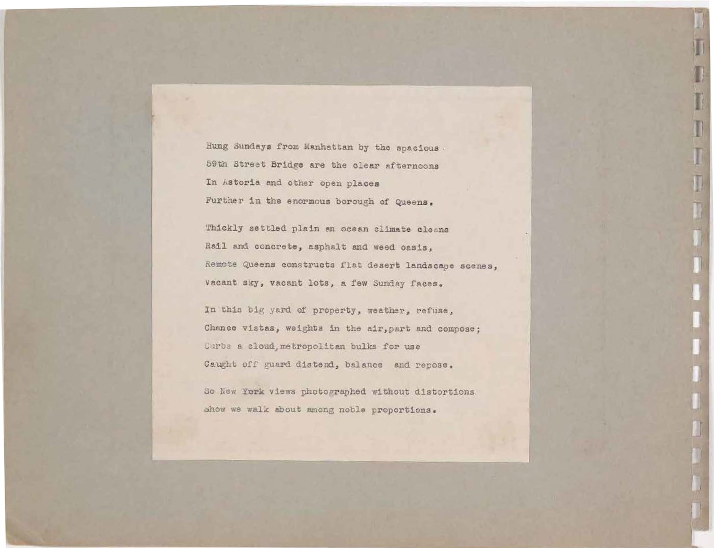 The exhibition, A Walk through Astoria and Other Places in Queens, 1943 by Rudy Burckhardt & Edwin Denby at the Bruce Silverstein Gallery (September 14–November 22, 2017), represents the third collaboration between these two men, a photographer and a poet, resulting in a unique album of sequenced photographs and typewritten sonnets. In 1939, Burckhardt and Denby compiled their first album, New York, N. Why?, which is in the collection of the Metropolitan Museum of Art. In 1940, the two men went to Queens and made another album of photographs and poems, An Afternoon in Astoria (1940), which is in the collection of the Museum of Modern Art. In 1943, Burckhardt and Denby collaborated on their third album, A Walk through Astoria and Other Places in Queens, or what the poet calls, in the first sonnet, a “backyard of exploitation and refuse.”