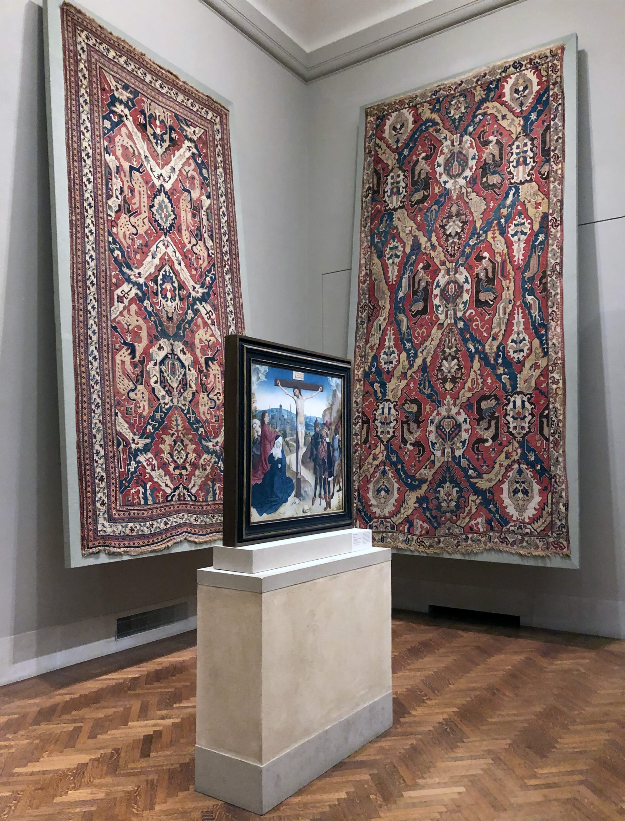 Two "Dragon" carpets from the Caucasus hanging in the Philadelphia Museum of Art in 2018. The carpet on the left dates to the 18th century and is believed to be possibly from Shushi/Shusha, while the one from the right dates from the 17th or 18th century and may be from Shemakha or Shirvan provinces. The identification of location for older carpets can often be quite difficult to pinpoint. (photo Hrag Vartanian/Hyperallergic)