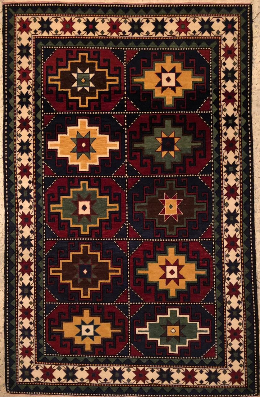 The Khndzoresk is also referred to as Cloudband Karabagh or Kazak Cloudband due to the cloudlike motifs in the hexagonal or octagonal medallions in the field. The Armenians compare them to serpents which is why they regard the Khndzoresk an ‘odzagorg’ or a serpent-rug. Different variations of the pattern exist. One of the most prototypical, however, is the ancient swastika icon as a central motif of the medallions. The arms or hooks of the swastika are usually pinned together by a knotted dot and surrounded by serpents in the form of the letter “S” or Chinese cloud bands. A motif of an abstract tree is usually seen next to it.