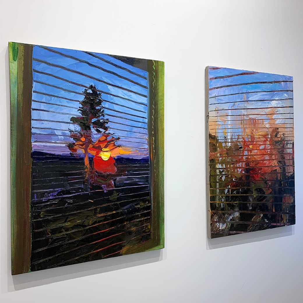 I began with the studio of Jeffrey Morabito at Art Cake, which was filled to the literal brim with contemporary iconography — bagels, tennis balls, airplane windows, chain link fencing — and impasto paintings that reveal the inherent menace in everyday objects. Moving around the work, a graffitied gate begins to look more and more like a teasingly lush landscape, while a silhouetted sunset begins to melt, dripping through the venetian blinds obscuring our view. Blurring the line between rural and urban, often using the formal structure of circles and lines, he seductively distorts the landscape of our everyday consumption.