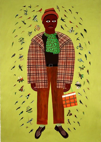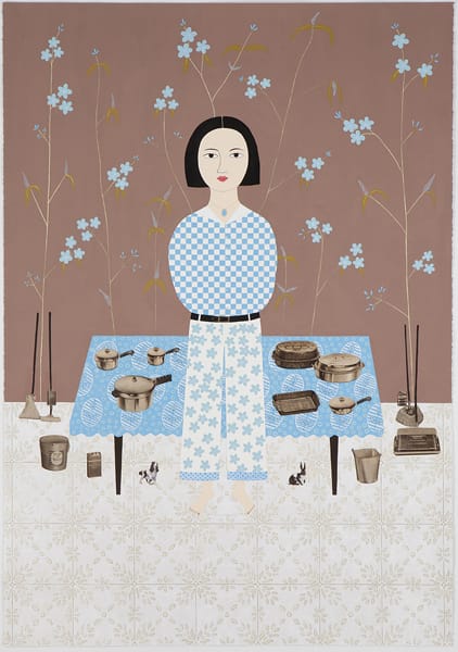 In much of the work, the subjects perform mundane functions, such as ironing laundry, pouring coffee, arranging dinnerware. However, in a few paintings, such as “Lucky Apparel” and “Perseverance Brings Good Fortune,” the subjects do not so much inhabit a specific place as they float in a neon ether, encircled by an aura of birds. Who are these people? Saints? Martyrs? Angels?