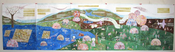So I may not agree with her personal vision of the world, but I do love the manner in which she creates it. Her pictures, which seamlessly incorporate paint, text, collage and fabric, are handmade, obsessive and kind of insane. When she nails it, as she does in “A Utopian Village, After Bosch” (2011), the work has a cinematic scope of vision. This painting depicts a teeming lakeside village in springtime, which sprouts more geodesic domes than the eye can count. Like Persian manuscripts, this painting required my undivided attention. The longer I looked at a painting, the more details and themes emerged.