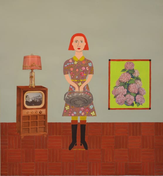 The dour-faced hostess in “Trumpet Sonata” wears a floral print cocktail dress, lined knee highs and black go-go boots. She stands ramrod straight, a silver platter in her paws. If I did not know better, I’d think Fradkin is a fan of the Mad Men tv series. This interior, with parquet floor, vintage television set and weird floral painting, whispers Peggy Olson.