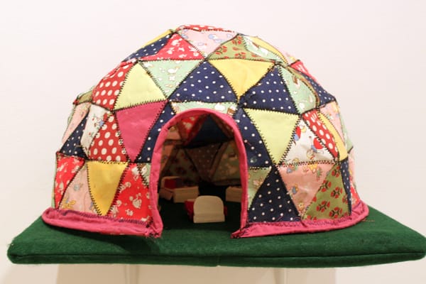 But by far, my favorite work in the show is her suite of hand-stitched geodesic domes. I love the choice of fabric, which includes prints of ducks, bunnies and children. It’s nostalgic, playful and rides the edge of loathsome and odious. She exercises fanatic attention to detail as well. (Look at all those stitches!) In “Proposal for place to learn about history,” she constructed a tiny library, which houses more than 150 tiny hand-bound books. In “Proposal for a communal place to rest,” she constructed five miniature beds, each with duvet covers and pillows. As I write this, I can’t help but picture a young Wilson directing a utopian melodrama inside a dollhouse, with some irate deejay from W.B.A.I. screaming about Ronald Reagan.