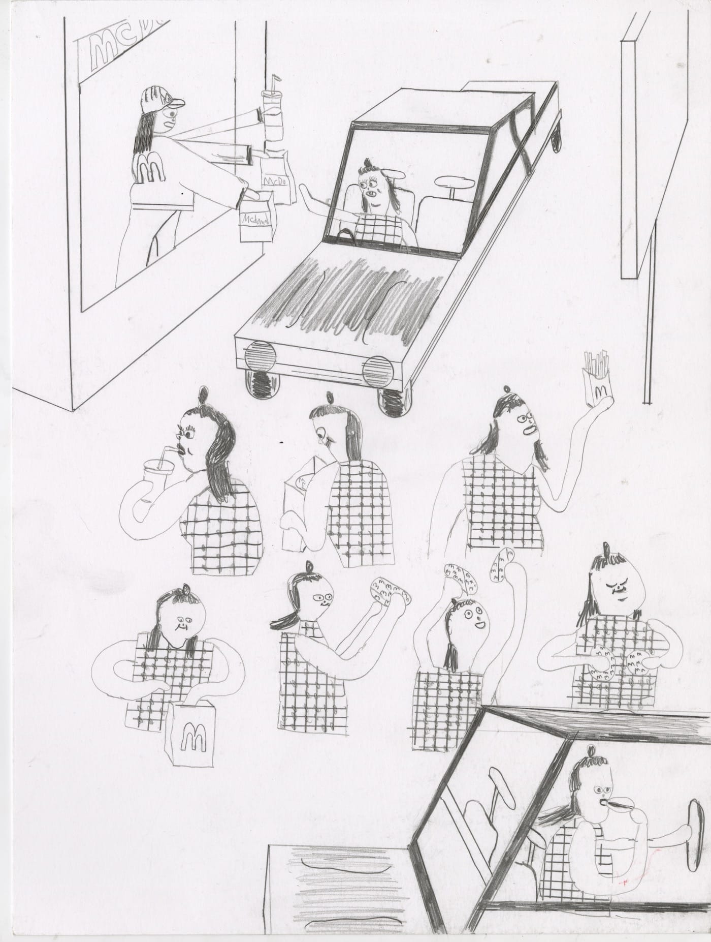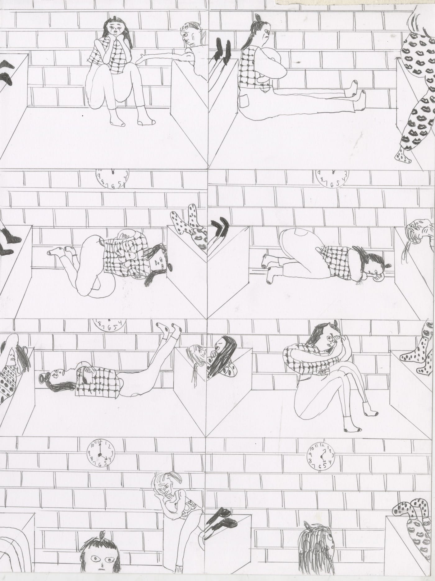 Booth’s drawing style is far from figure-flattering, which allows it to capture the mannerisms and disturbances human beings can display in social situations. She is a master of self-deprecation, translating her shameful actions into gloriously taboo moments of artistic revelation. She does this by creating artwork about identity and expectations during times she is not at her best but perhaps not at an all-time low, like when she is in the holding cell in isolation, watching the clock in tears, and has no one to turn to but herself.