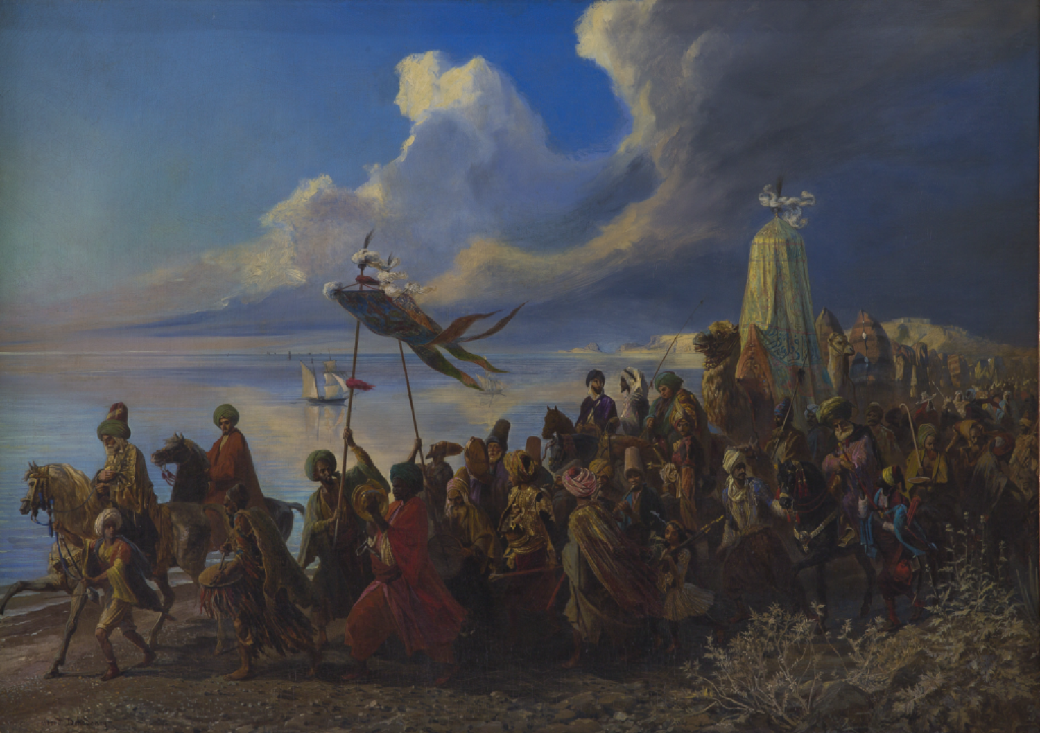 The conceit of Orientalism — that the pejorative tropes regurgitated in the art, literature, and history produced by Europeans somehow constitute an unassailably objective body of knowledge — makes the use of “inspired” in the exhibition title rather difficult to accept. Muslims are presented in the artworks as monolithic entities, or “types,” whose values are determined by European viewers. If male, he is passive and only defined by his faith — Bridgman’s “Prayer” follows a long tradition of artists focusing on Islam, the Hajj, or Mecca in their paintings.